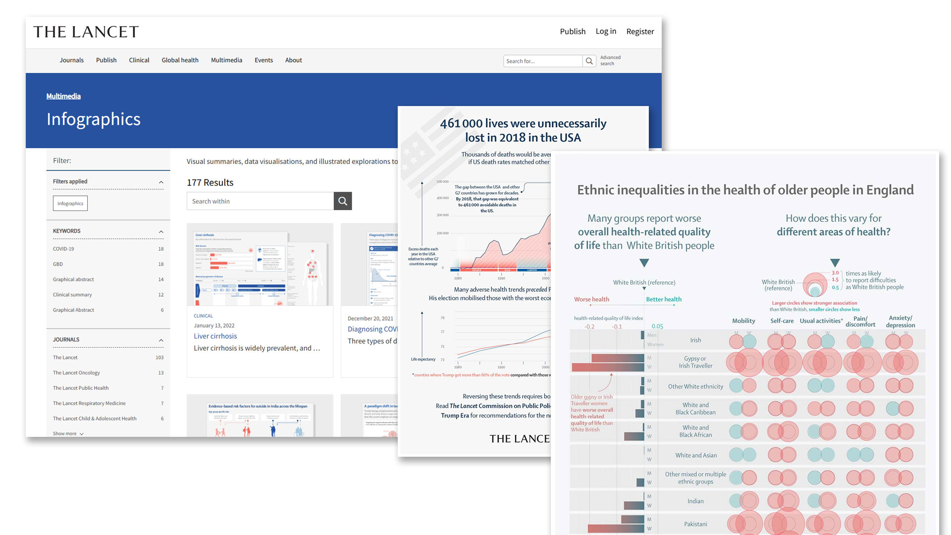 For years, The Lancet had produced infographics sporadically, or published those submitted by authors alongside their papers, resulting in wide variation in style, quality, and impact. We established a clear system for identifying when an additional infographic could elevate published content and directly increase its impact for a well-defined audience, such as policy-makers needing to understand an important new conclusion, or healthcare professionals in need of a quick overview of practice-changing results. We created a new infographics designer role, and with them established new repeatable formats with targeted goals, such as clinical disease summaries, visual abstracts, and graphics based on important new research. You can see the continuing legacy of this programme at The Lancet.